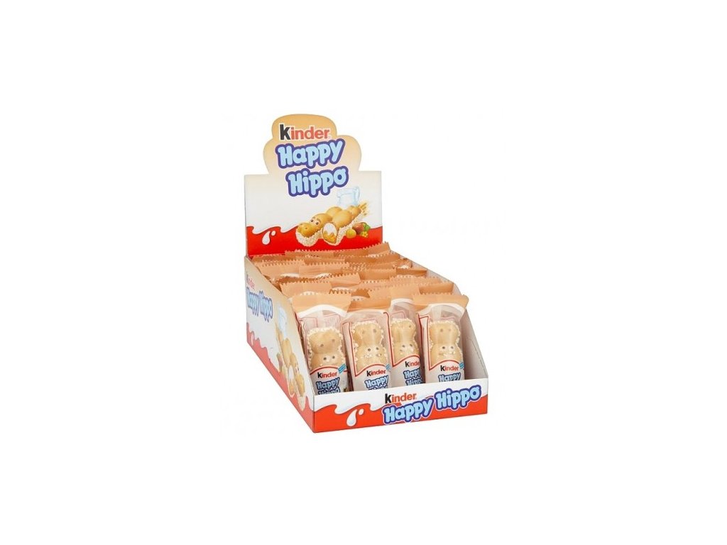 Kinder Happy Hippo to chrupiący wafelek w kształcie hipopotama z podwójnym kremowym nadzieniem w środku i ozdobiony pysznymi kulkami kakaowymi na zewnątrz.