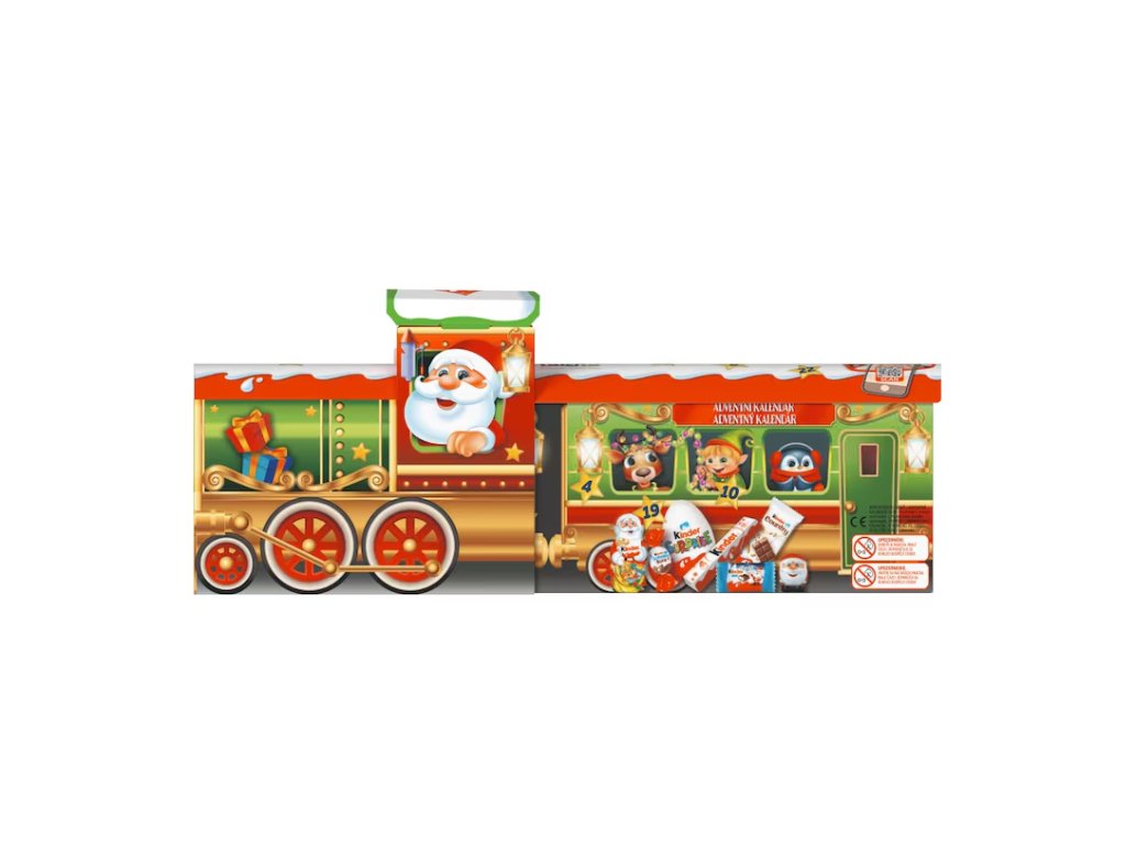 Przygotuj się na magiczne odliczanie do Świąt Bożego Narodzenia z kalendarzem adwentowym Kinder Train! Codziennie aż do Świąt Bożego Narodzenia czeka na Państwa niespodzianka w postaci pysznych czekoladek Kinder i innych słodkości. Pociąg zachwyci nie tylko małych, ale i dużych miłośników czekolady i wprowadzi świąteczną atmosferę do Twojego domu. Dzięki atrakcyjnemu wzornictwu i zabawnym motywom stanie się piękną częścią świątecznej dekoracji. Otwórz okna i ciesz się radością oczekiwania na Święta Bożego Narodzenia!