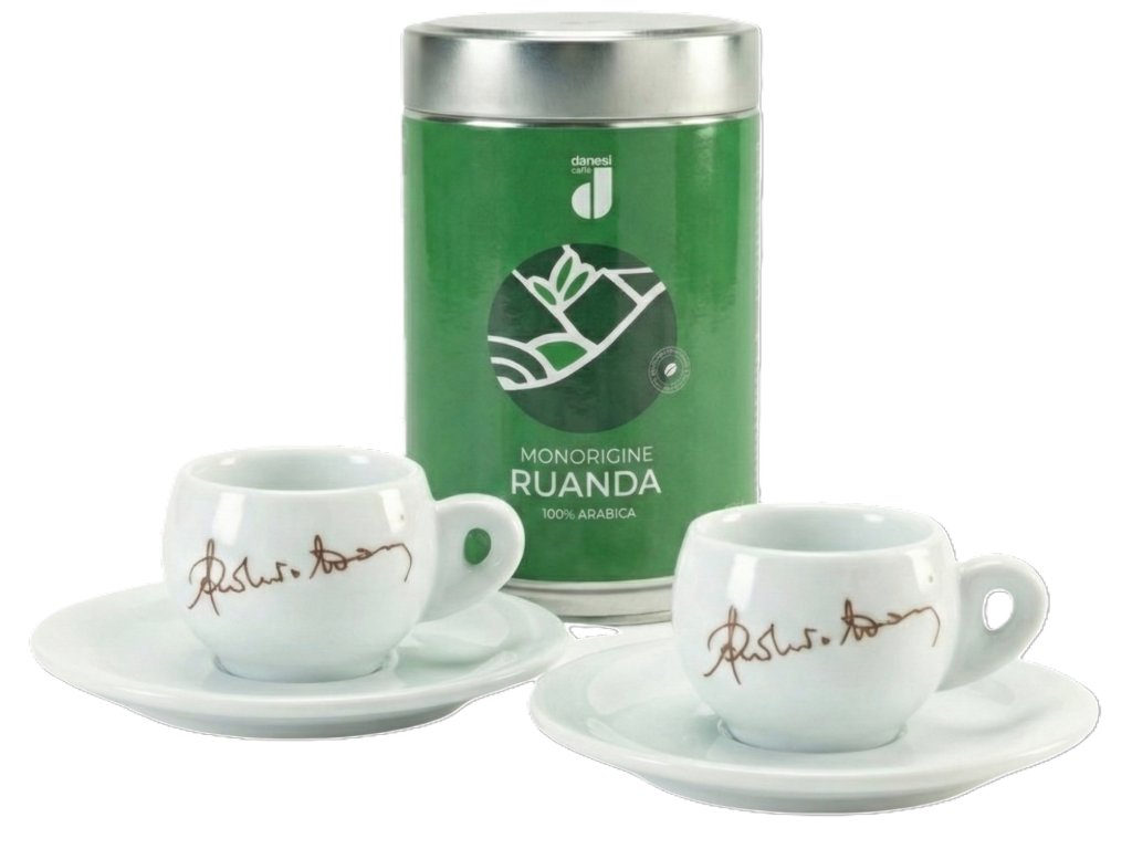 Zestaw Danesi Duo Plus Green Ruanda Grain - Ciemne ziarna kawy w kasecie 250 g + 2 filiżanki i 2 spodki - zielony