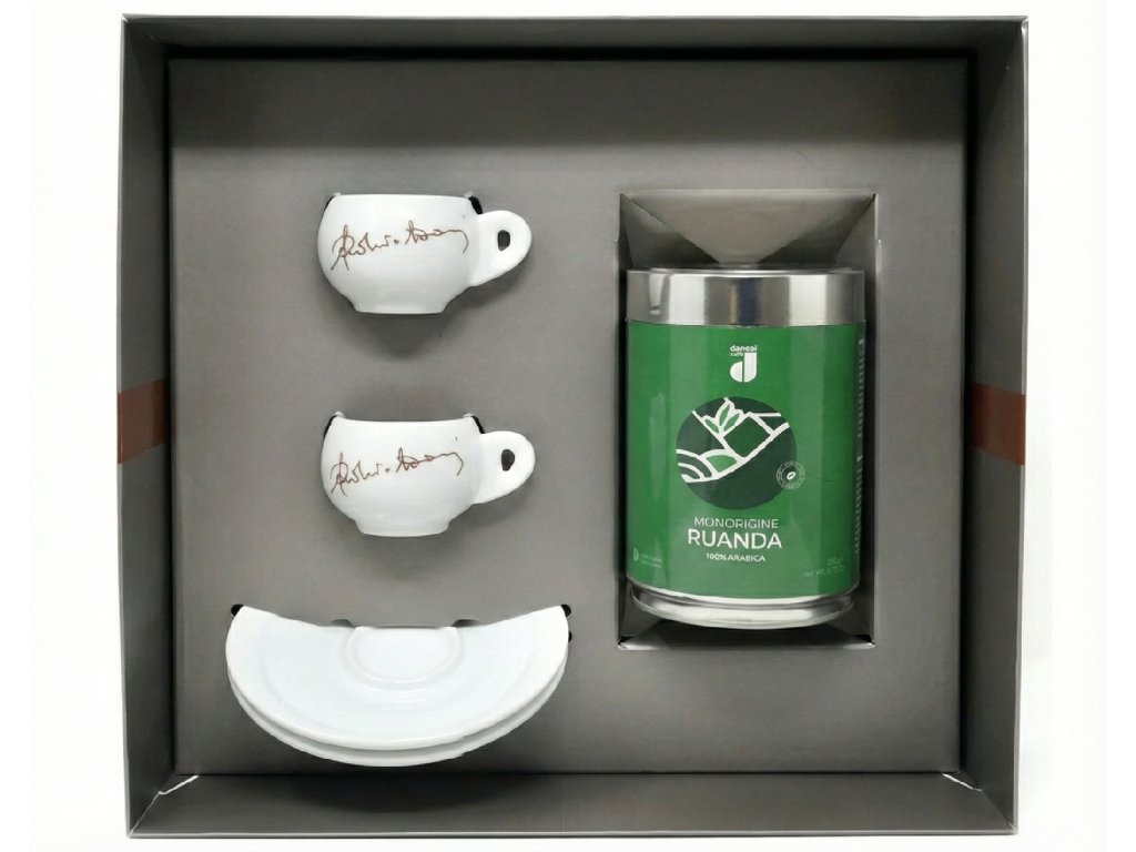 W eleganckim opakowaniu znajdziesz 250 g wyselekcjonowanej mielonej kawy z Rwandy , która oczaruje Cię swoją gładkością i egzotycznym aromatem. Dopełnieniem zestawu są dwie designerskie filiżanki ze spodkami w kojącym zielonym kolorze. To idealne zaproszenie do wspólnego spotkania przy kawie – czy to z partnerem, czy z najlepszą przyjaciółką.