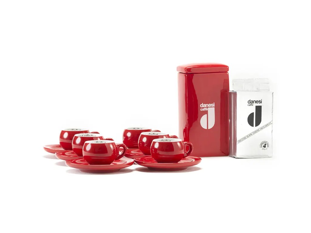 Zestaw upominkowy Danesi La Forma - Dark's Cassette Kava 250g + 6 filiżanek do espresso i 6 spodków - czerwony
